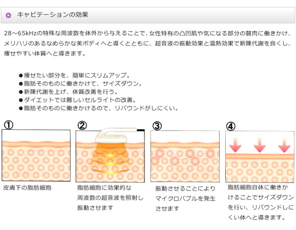 一般的には特殊な超音波によって、流れる液体中で圧力が変化した際に発する気泡により、物体にダメージを与える現象のことです。超音波で脂肪細胞に振動を与えて気泡を発生させ、その泡がはじける際の衝撃圧力によって脂肪細胞自体を減少させていきます。